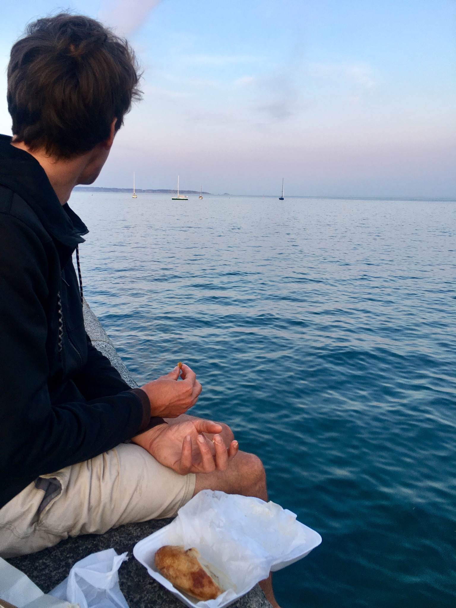 Temps idéal pour des vacances en Normandie. Nuit calme, réveil sous un ciel bleu ; nous prenons la direction de Guernesey. Habitué à slalomer entre les roches et cailloux, nous prenons le passage du singe où nous décidons de prendre le temps de pêcher des maquereaux. Après cette belle pêche et de beaux coups de soleil, nous arrivons en fin de journée à Guernesey. C’est toujours un réel plaisir de s’amarrer à Guernesey, ce tout petit port au cœur de la ville est typiquement anglais et nous fait voyager. Dès notre arrivée, nous nous accommodons à « l’English Style » : english breakfast et fish and chips!
